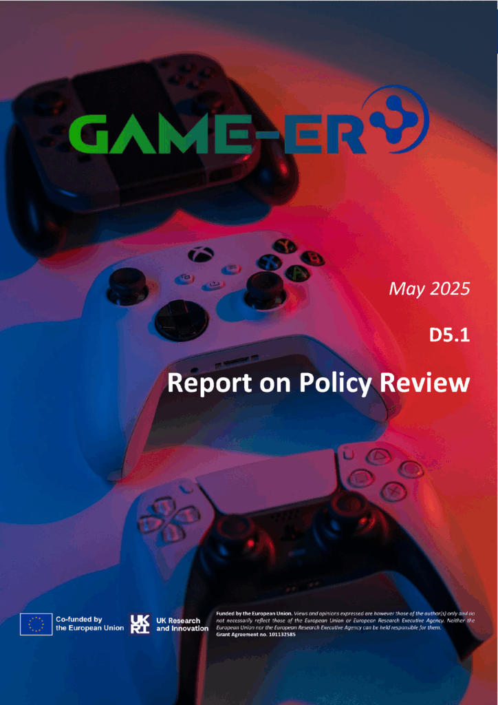During the first year of the GAME-ER project a comprehensive review of current and existing policies and recommendations related to the project clusters, at local, national, and European level has been carried out. A total of 42 documents authored or commissioned by key stakeholders in the area of video game industry policy were identified (through web research, as well as by means of contacting industry organizations and leveraging their understanding of this area. Reference lists of the policy documents were also used to gather additional documents), between May 2025 and January 2025 and analyzed. The data was analyzed qualitatively in two separate analysis.